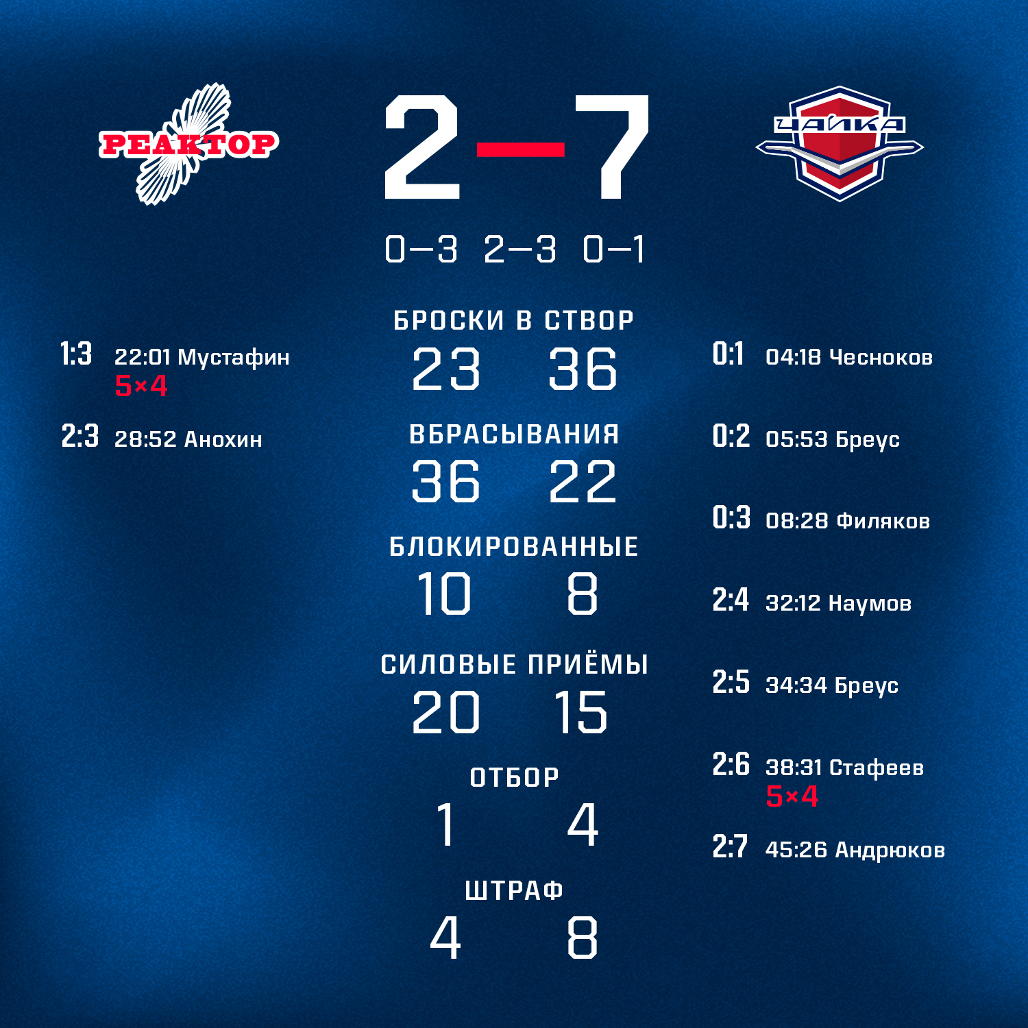 Гости быстро повели 3:0, но в дебюте второго периода «Реактор» бросился в погоню и смог сократить разрыв до минимума. Отличились Ренард Мустафин (первая шайба в МХЛ) и Павел Анохин.К сожалению, догнать нижегородцев не получилось, а гости смогли еще четырежды поразить ворота нижнекамцев.