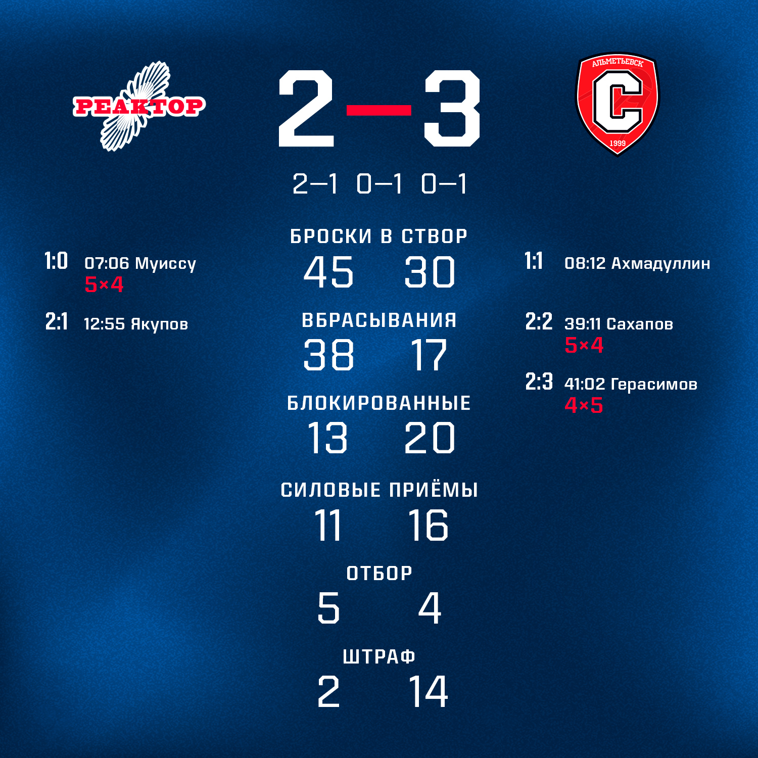 Счет в игре открыл Крис Муиссу, но гости быстро отыгрались. Равным счет долго не продержался и Рауль Якупов снова вывел «реакторщиков» вперед.Весь второй период нижнекамцы играли с огромным преимуществом, но пропустили на последних секундах отрезка в меньшинстве.