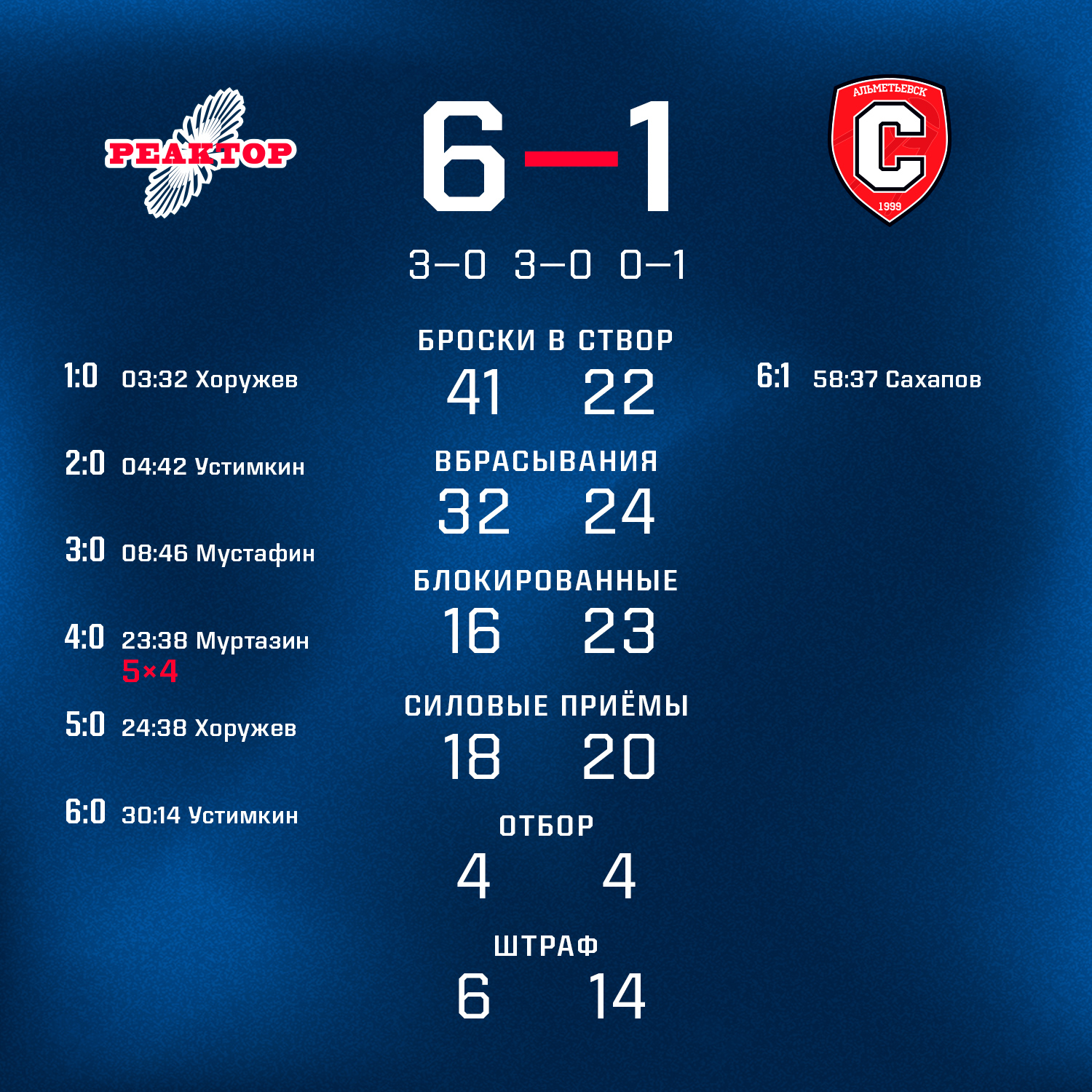Уже к 9-й минуте игры нижнекамцы повели 3:0 после шайб Никиты Хоружева, Максима Устимкина и Ренарда Мустафина.Во втором периоде игроки «Реактора» забросили ещ три безответные шайбы после бросков Марселя Муртазина и все тех же Хоружева и Устимкина.