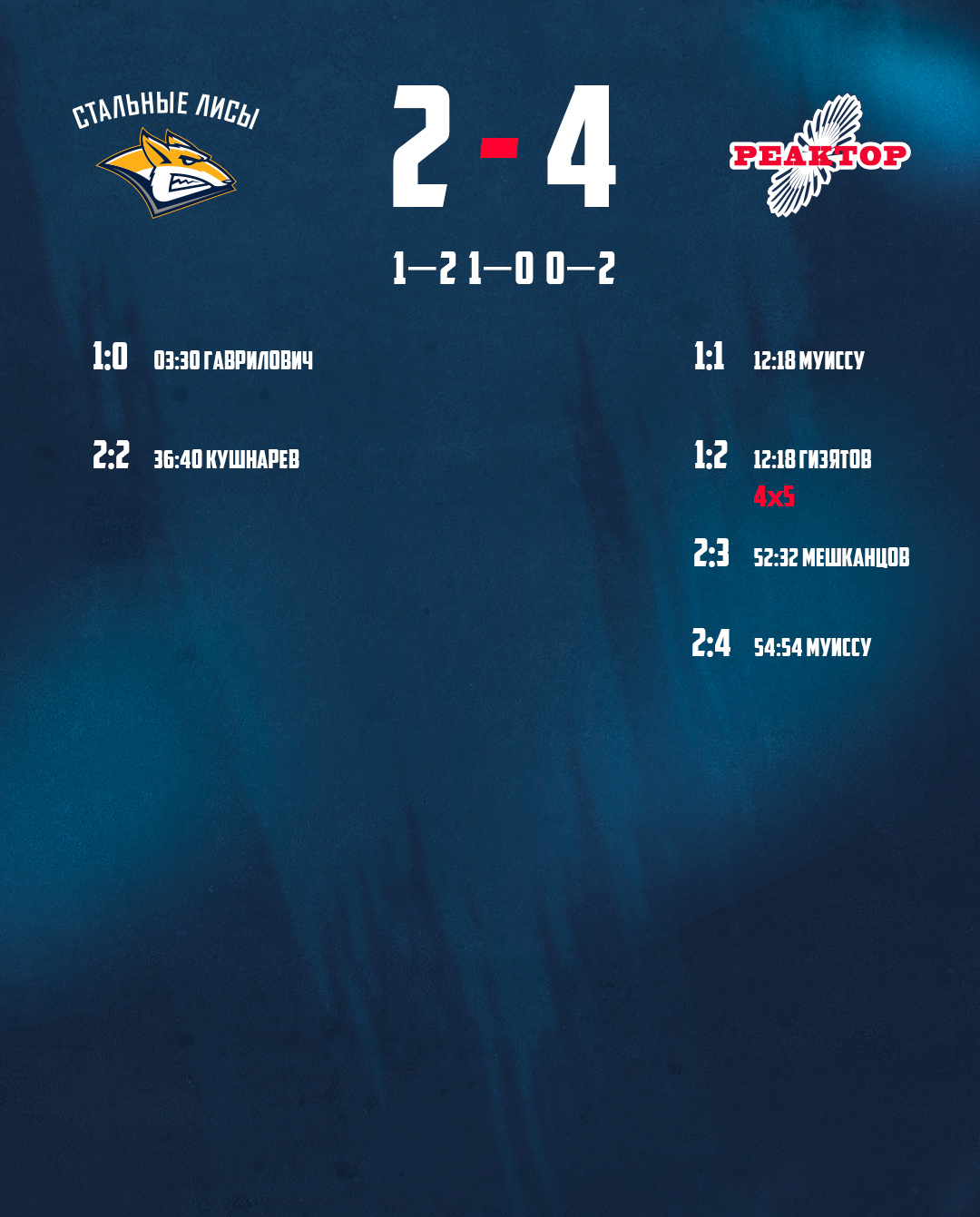 Начало поединка получилось для нижнекамцев неудачным. Магнитогорцы открыли счет на четвертой минуте игры. Однако еще до первого перерыва Жоэ Кристоф Муиссу и Амир Гизятов полностью перевернули характер матча.В концовке второго периода «лисы» смогли сравнять счет ценой огромных усилий. Обоюдоострая игра продолжалась и в заключительные 20 минут поединка. Исход встречи решился на последних минутах. Николай Мешканцов и все тот же Муиссу своей активной игрой на пятаке соперника забросили две шайбы и принесли «Реактору» первую победу этого лета и на турнире.