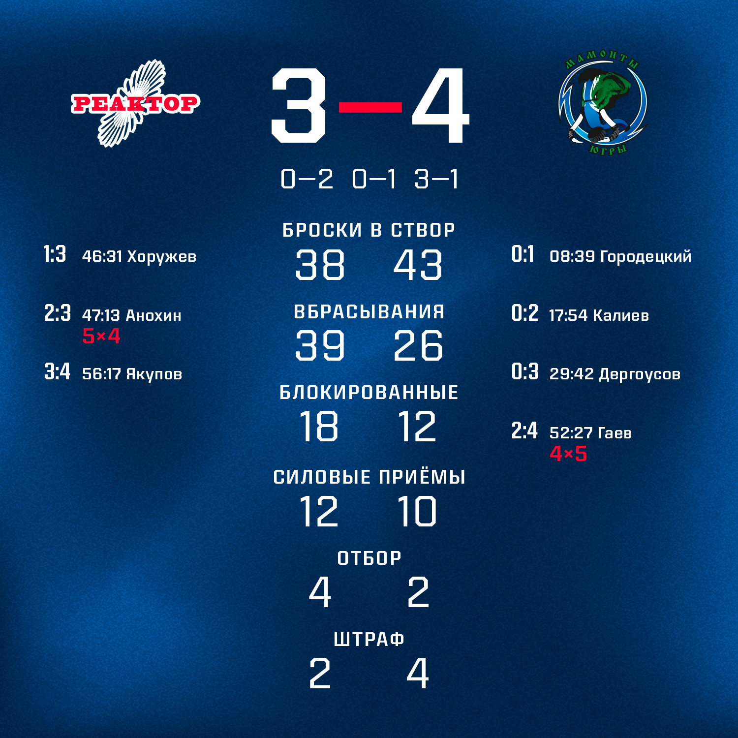 К началу третьего периода «реакторщики» уступали 0:3, но смогли вернуться в игру. Никита Хоружев и Павел Анохин сократили разрыв до минимума. К сожалению, именно в этот момент, играя в большинстве, нижнекамцы пропустили гол. Как оказалось, решающий в этот вечер. Рауль Якупов отыграл еще одну шайбу, но спасти игру уже не получилось...Следующий матч «Реактор» проведет 9 февраля в Альметьевске, где сыграет с местным «Спутником».