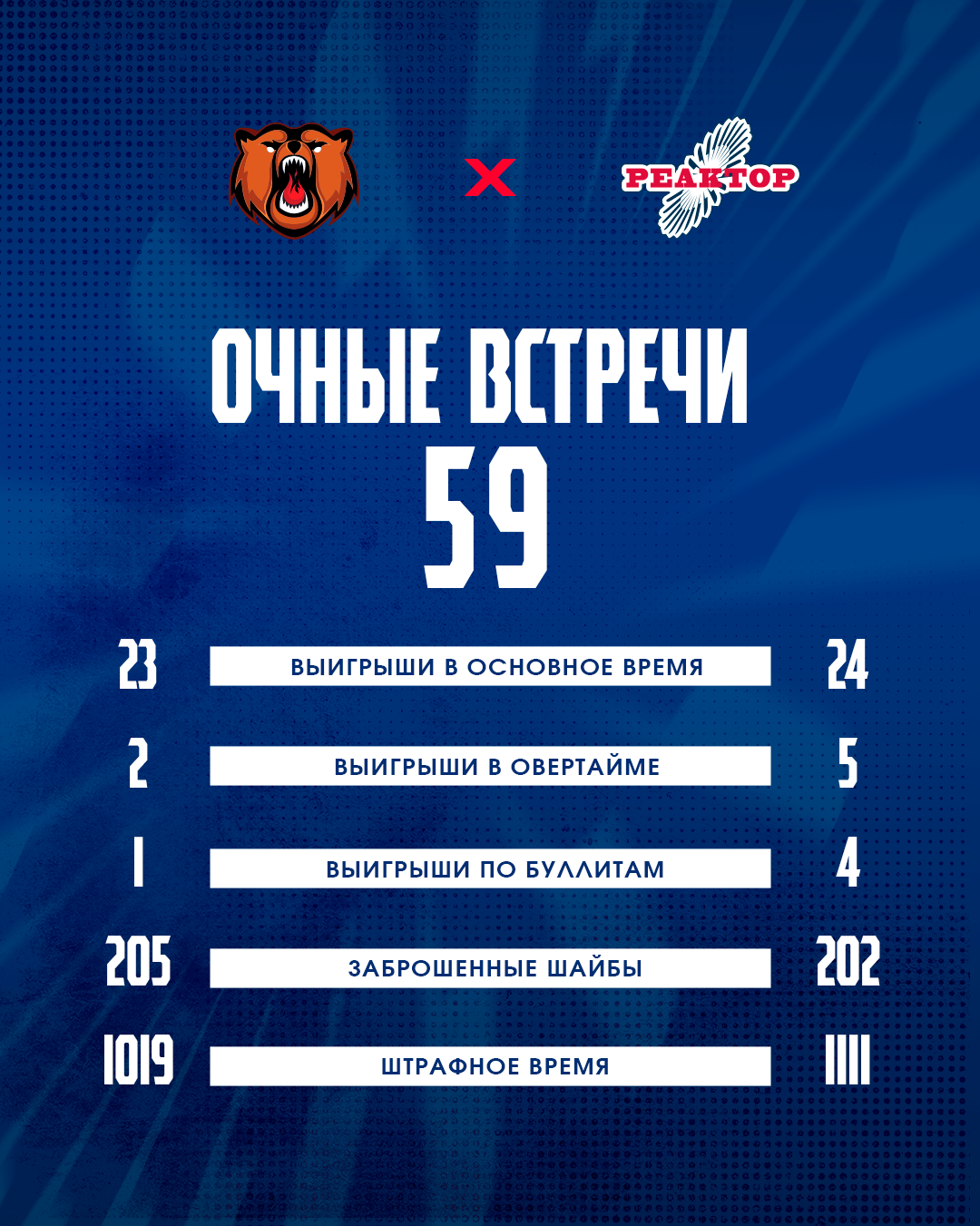 Команды встречались друг с другом 59 раз. На счету «Медведей» 26 побед, у «Реактора» — 33. В текущем сезоне команды провели игру в Нижнекамске, и в тот декабрьский вечер «реакторщики» добились победы со счетом 5:3.