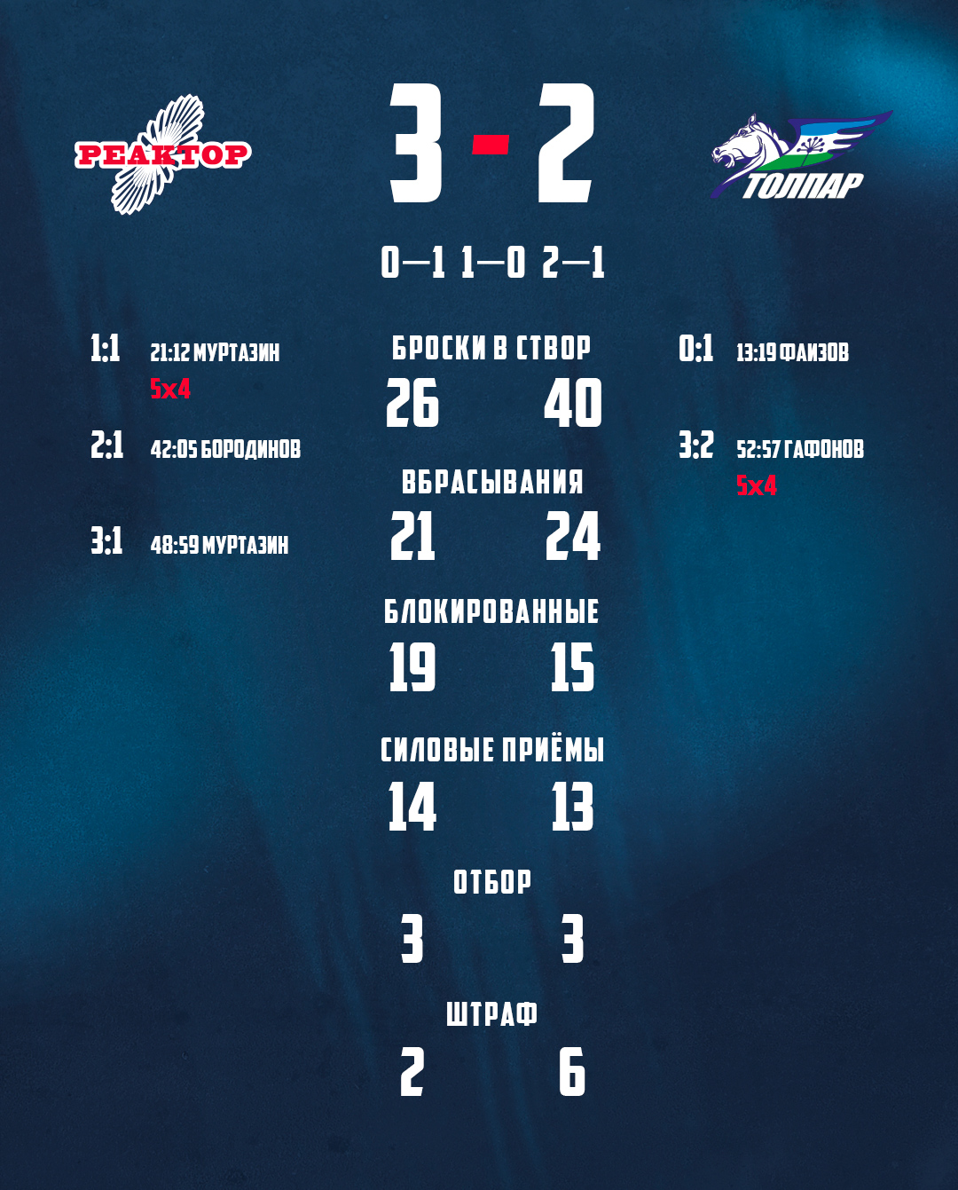 Сегодняшний поединок получился куда более острым, чем накануне. Уфимцы вышли вперед в первом периоде. Помог отыграться «Реактору» Марсель Муртазин в начале второго периода.Главные события игры развернулись в заключительные 20 минут. Игорь Бородинов и Муртазин быстро увеличили преимущество нашей «молодежки» до двух шайб, но гости быстро одну отыграли и у матча получилась горячая концовка, которая завершилась победой «Реактора» 3:2.