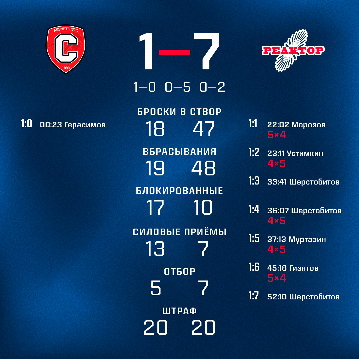 Сценарий поединка полностью повторил вчерашний. Хозяева быстро открыли счет, а дальше забивали только «реакторщики». Во втором периоде нижнекамцы отличились пять раз. При чем трижды сделали это в меньшинстве!В заключительном периоде «Реактор» забросили еще две шайбы и довел счет до вчерашнего. Отметим в сегодняшней игре хет-трик Данила Шерстобитова.