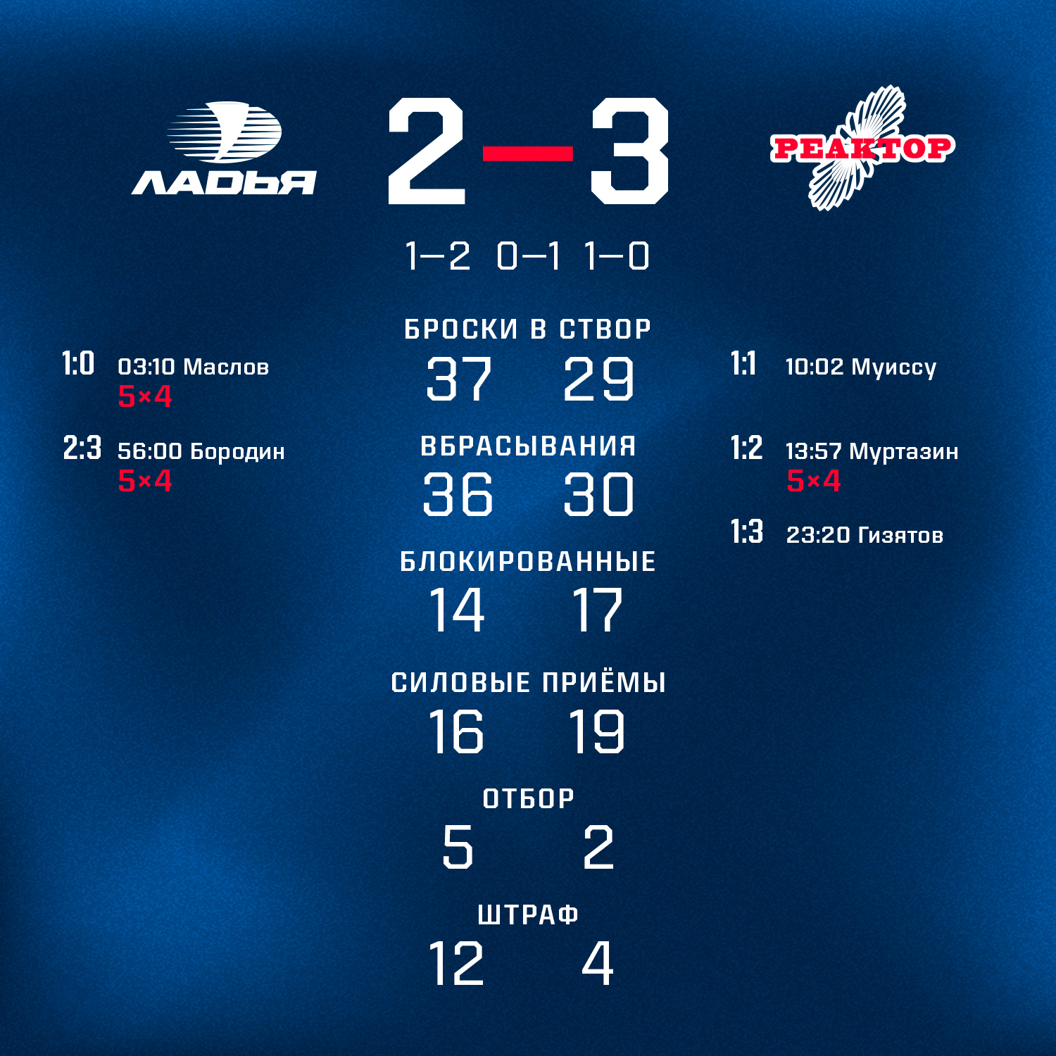 Начало игры сложилось неудачно для нижнецамцев. Хозяева повели в счете уже на четвертой минуте, но уже к первому перерыву счет был в пользу «реакторщиков» благодаря голам Жоэ Криса Муиссу и Марселя Муртазина.В дебюте второго периода Амир Гизятов увеличил разрыв в счете до двух шайб. Затем счет долго не менялся. В самой концовке игры «Ладья» смогла отквитать один гол, но на большее не хватило ни времени, ни сил. 3:2 – победа сегодня и нижнекамцы увозят важные 4 очка из Тольятти.