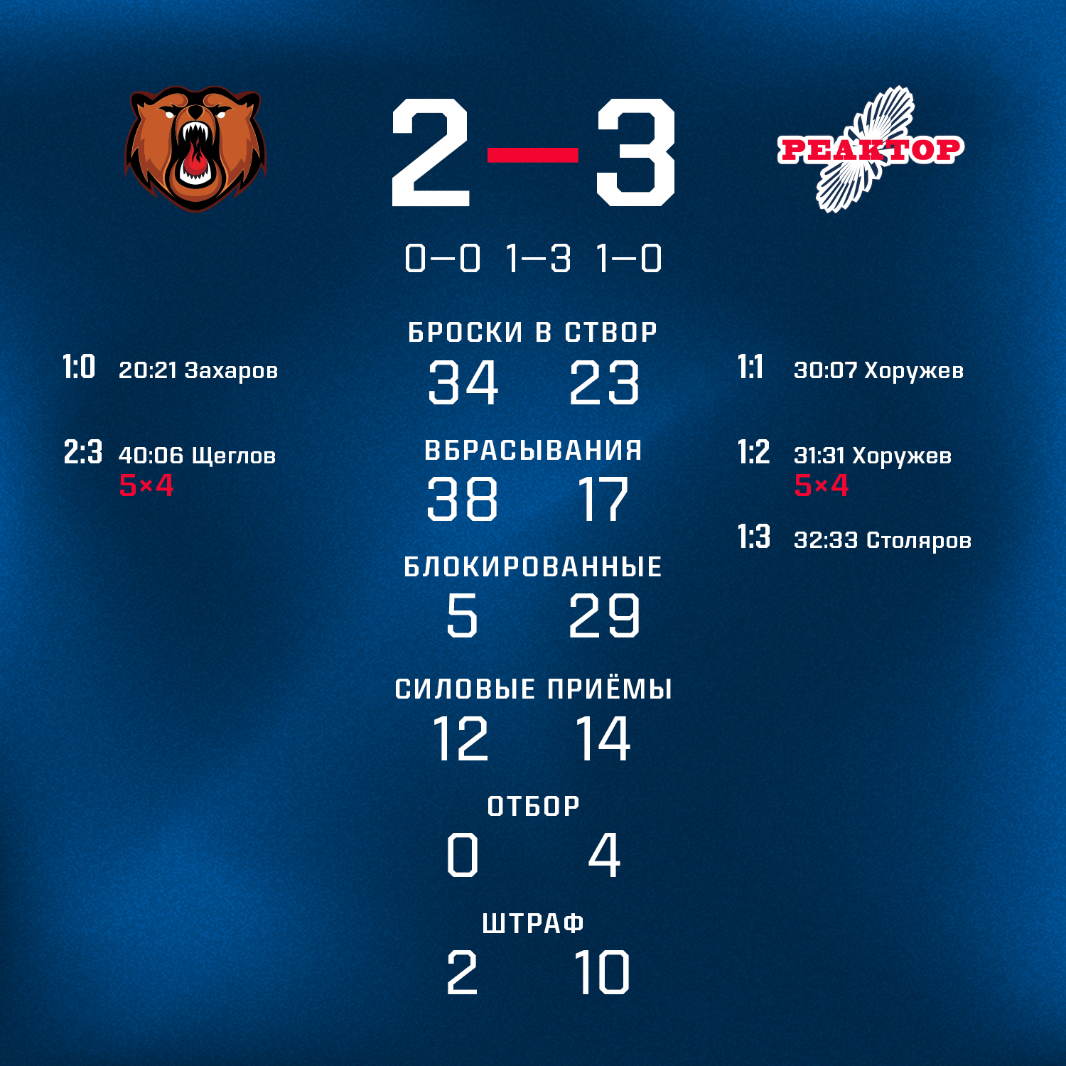 Исход матч решился во втором периоде, когда Никита Хоружев оформил дубль и еще одну шайбу забросил Кирилл Столяров. Именно она и стала победной в этой игре.Это был заключительный поединок «Реактора» в 2023 году. Следующую игру нижнекамцы проведут в Омске 4 января.