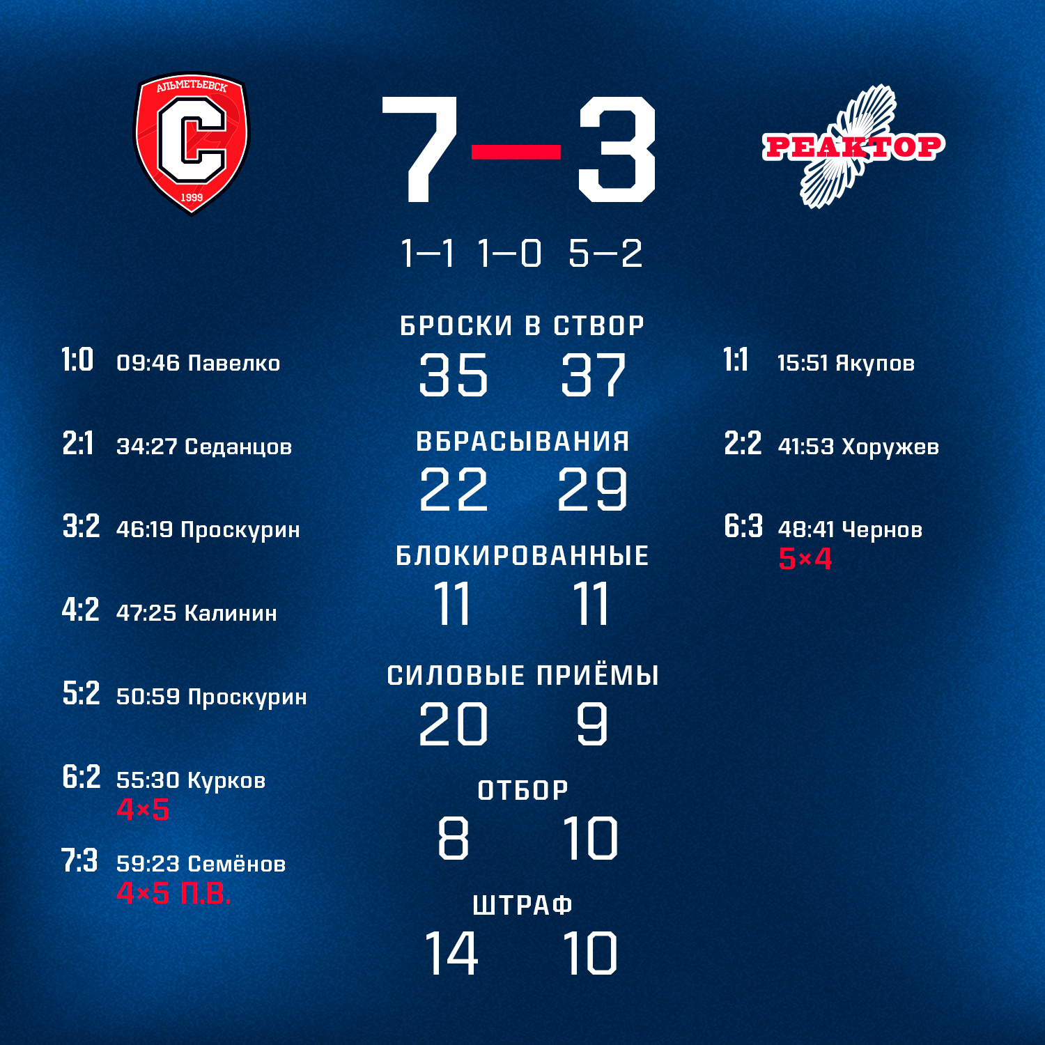 «Реакторщики» дважды по ходу матча смогли сравнивать счет благодаря голам Рауля Якупова и Никиты Хоружева, но решающее ускорение хозяев в третьем периоде отквитать уже не удалось.Этой игрой «Реактор» завершил свой сезон. Итоговое место в «серебряном» дивизионе определится по завершению всех матчей чемпионата.