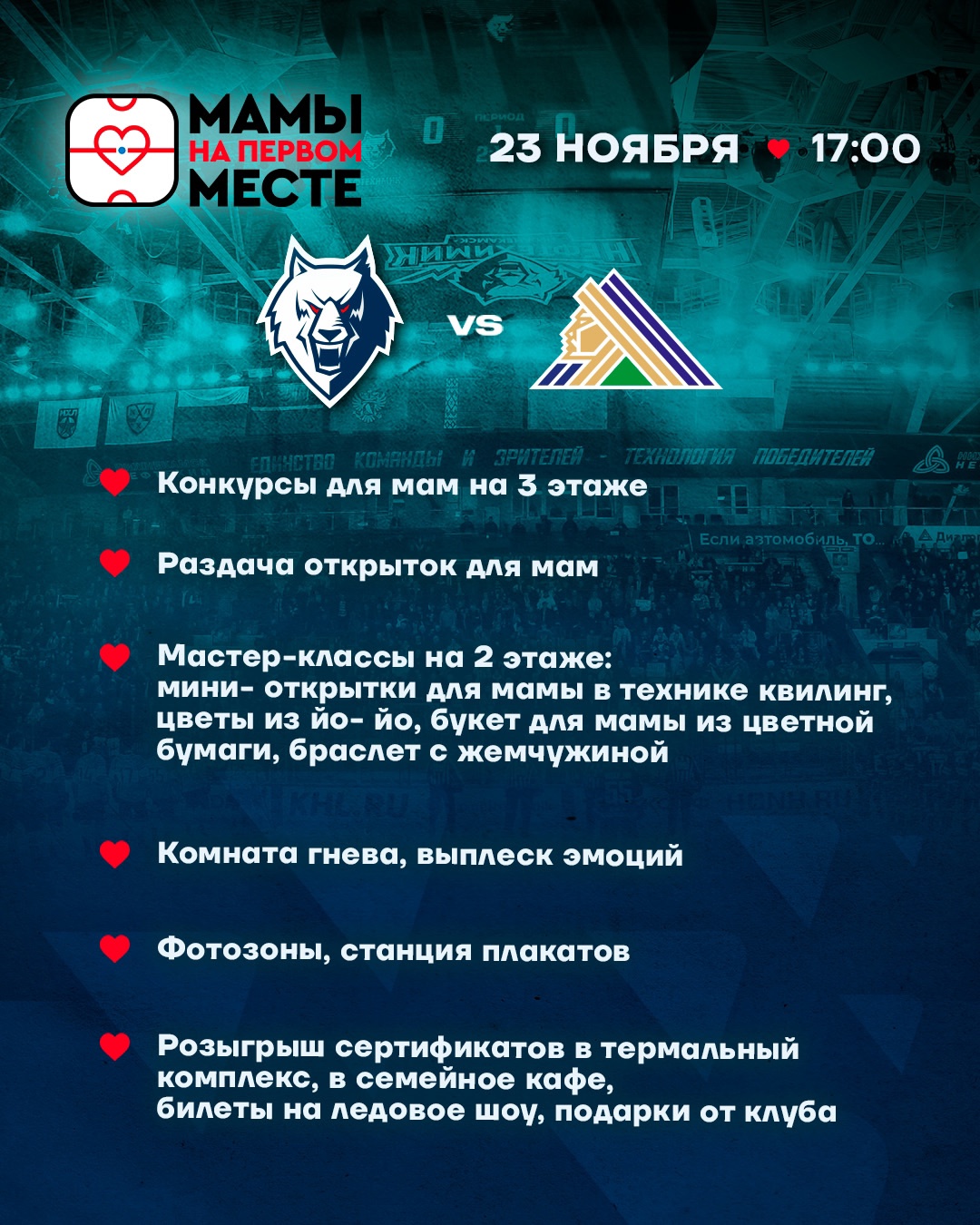 Все команды КХЛ в эти выходные выйдут с нашивками на свитерах с надписью «Мамы на первом месте». В связи с приближающимся праздником соответствовать будет развлекательная программа на игре с которой вы можете ознакомиться ниже.