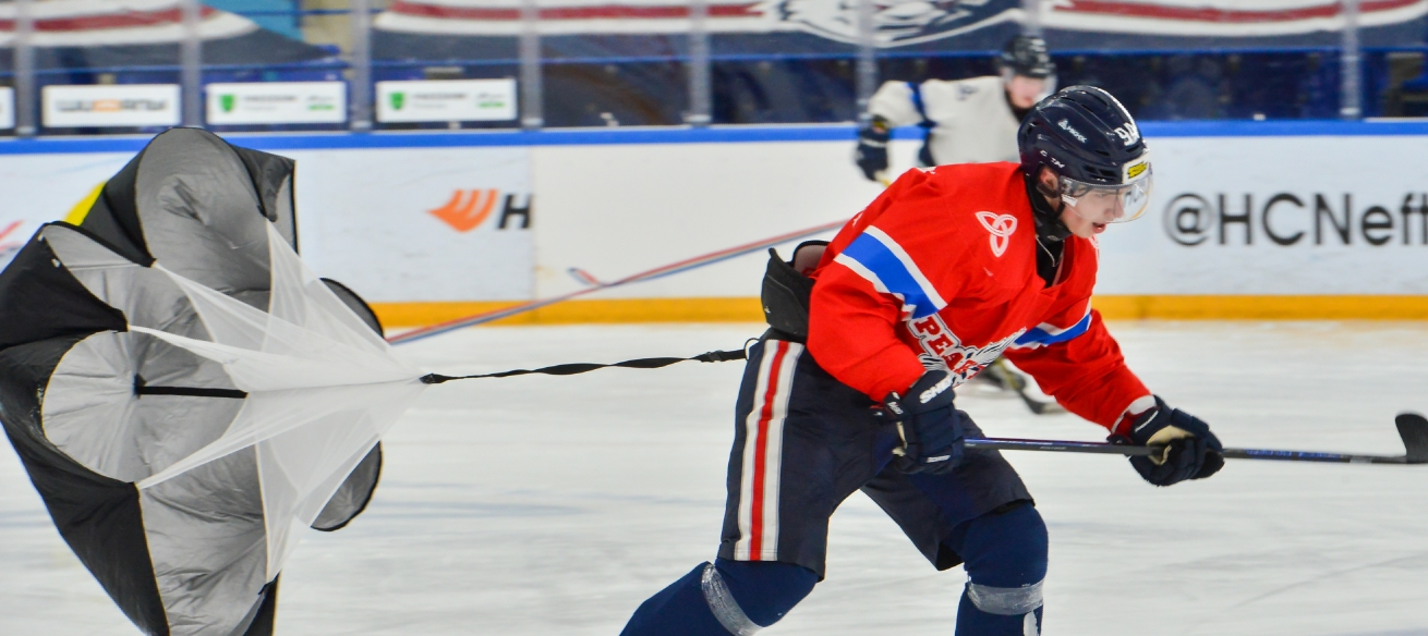 Небольшая разминка и хоккеисты по очереди начинают таскать баллоны, бегать с парашютами.