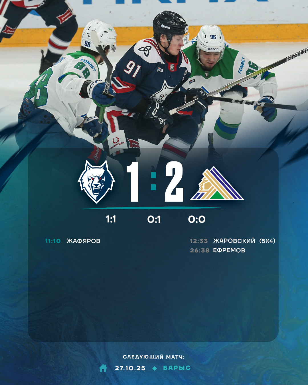 Первый период прошел при равной игре. Да, по острым моментам у ворот «волки» превосходили соперника. В частности, Герман Точилкин выходил один на один с вратарем, Евгений Митякин бросал с пятака, но в обоих случаях надежно сыграл голкипер гостей Семён Вязовой. В игре же не моменты считаются, а заброшенные в ворота шайбы. По этому показателю в первой двадцатиминутке получился паритет. На первый перерыв команды ушли при счете 1:1.Первыми отличились «волки». Дамир Жафяров после передачи Андрея Белозёрова вывел «Нефтехимик» вперед. Но ненадолго. Гости реализовали численное большинство. Масочник уфимцев Александр Жаровский, который еще в этой весной играл в ЮХЛ, получив шайбу в зоне «Нефтехимика», выдержал паузу и кистевым броском поразил дальний угол ворот Ярослава Озолина.