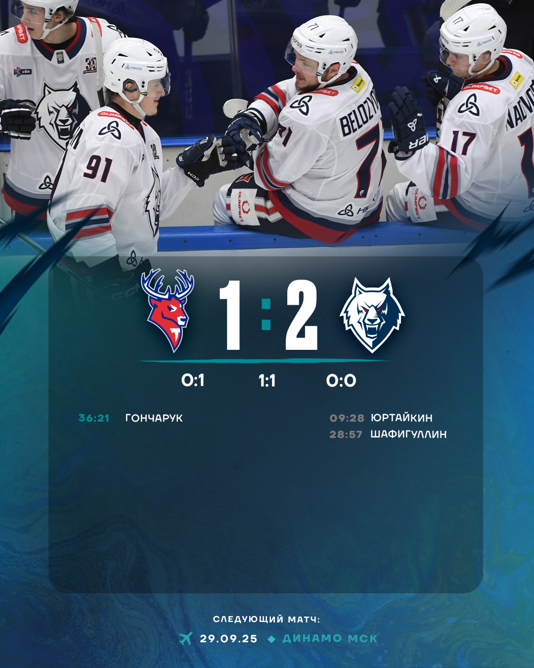 В третьем периоде счет этот не поменялся, хотя и несколько раз соперники сыграли в неравных составах. Хороший шанс забить имели «волки», играя «4 на 3». Но в этот вечер реализовать большинство нашей команде было не суждено. В результате в отчаянной борьбе нашей команде сохранить победный счет.