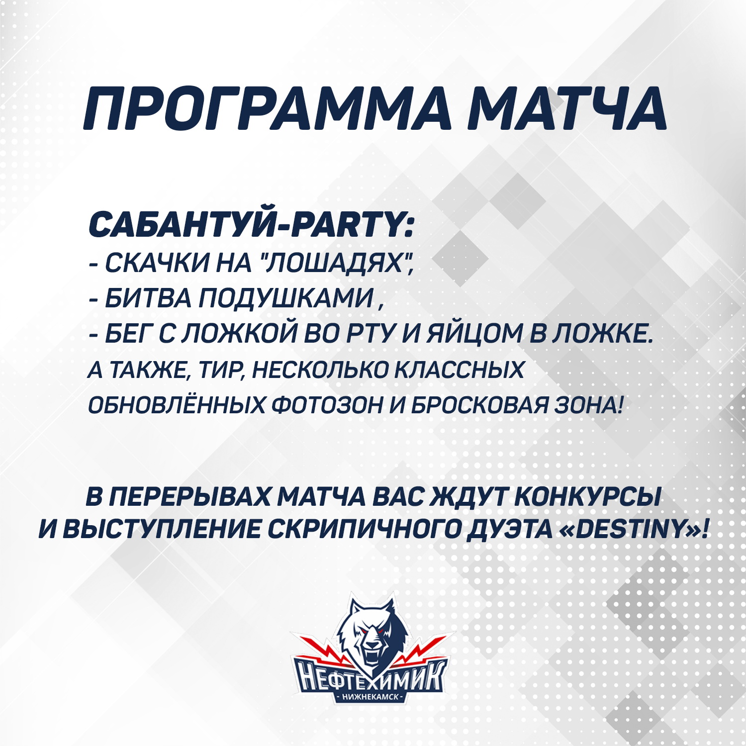 Начало поединка запланировано на 17.30. Если вы не сможете попасть на трибуны, то в прямом эфире поединок двух татарстанских команд можно будет посмотреть на телеканалах КХЛ ТВ, ТНВ и ТНВ Планета.Помимо самого хоккея, сегодня на матче болельщиков ждет Сабантуй-Party. Вот его программа