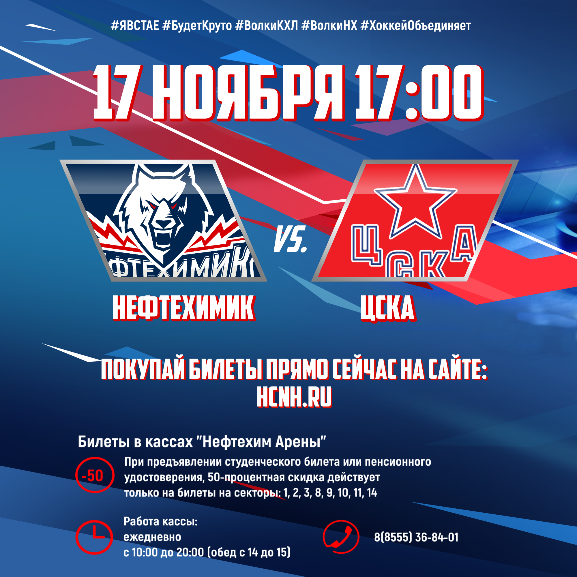 В субботу «Волки» встречаются с финалистом Кубка Гагарина прошлого сезона московским ЦСКА! Это будет настоящая битва! Мы ждем вас! Билеты в кассах «Нефтехим Арены» и на нашем сайте!На матч «Нефтехимик» - ЦСКА установлены следующие цены: