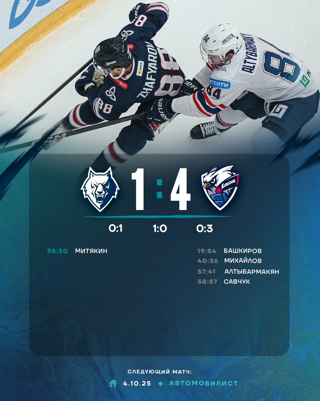 В первом периоде «волки» имели несколько отличных возможностей, чтобы огорчить вратаря гостей Бочарова, но в каждый раз самоотверженно играла оборона «Лады»: полевые игроки смело блокировали броски, а голкипер на последнем рубеже действовал надежно. За шесть секунд до первого перерыва гости сумели открыть счет. Не сказать, что они редко атаковали. Тольяттинцы при первой же возможности шли вперед, часто беспокоили Долганова. Вот и, как говорится, в раздевалочку им удалось забить гол.Во втором периоде наша команда бросилась отыгрываться. Отличный шанс упустил Андрей Белозёров. Его чистый выход один на один с Бочаровым не увенчался успехом. Форвард вроде всё сделал правильно, но в последний момент не смог перекинуть шайбу через щиток вратаря. Всё же нашим удалось сравнять счет. Сделал это Женя Митякин.