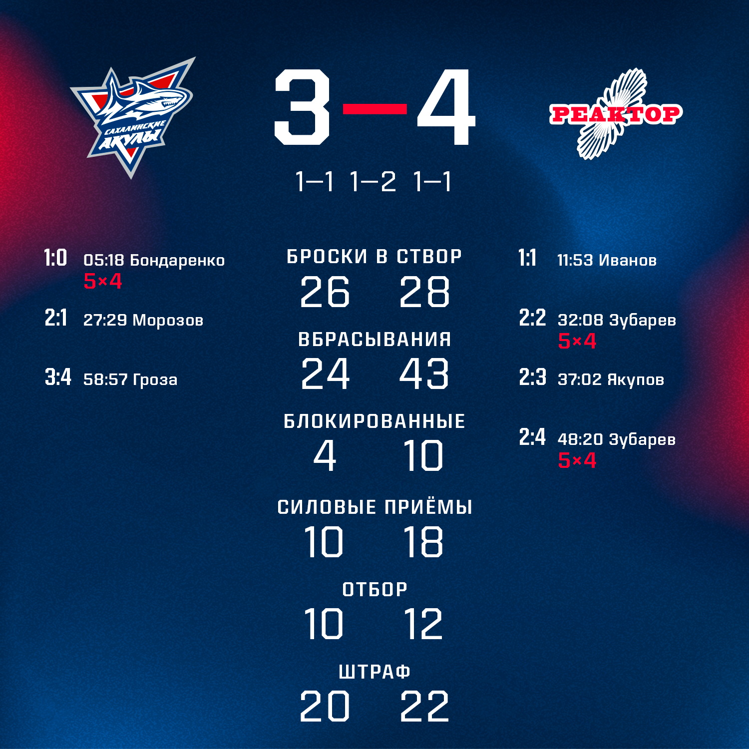 В своем первом матче на предсезонном турнире «Кубок Сахарова» «Реактор» в упорнейшей борьбе переиграл «Сахалинских Акул» 4:3.