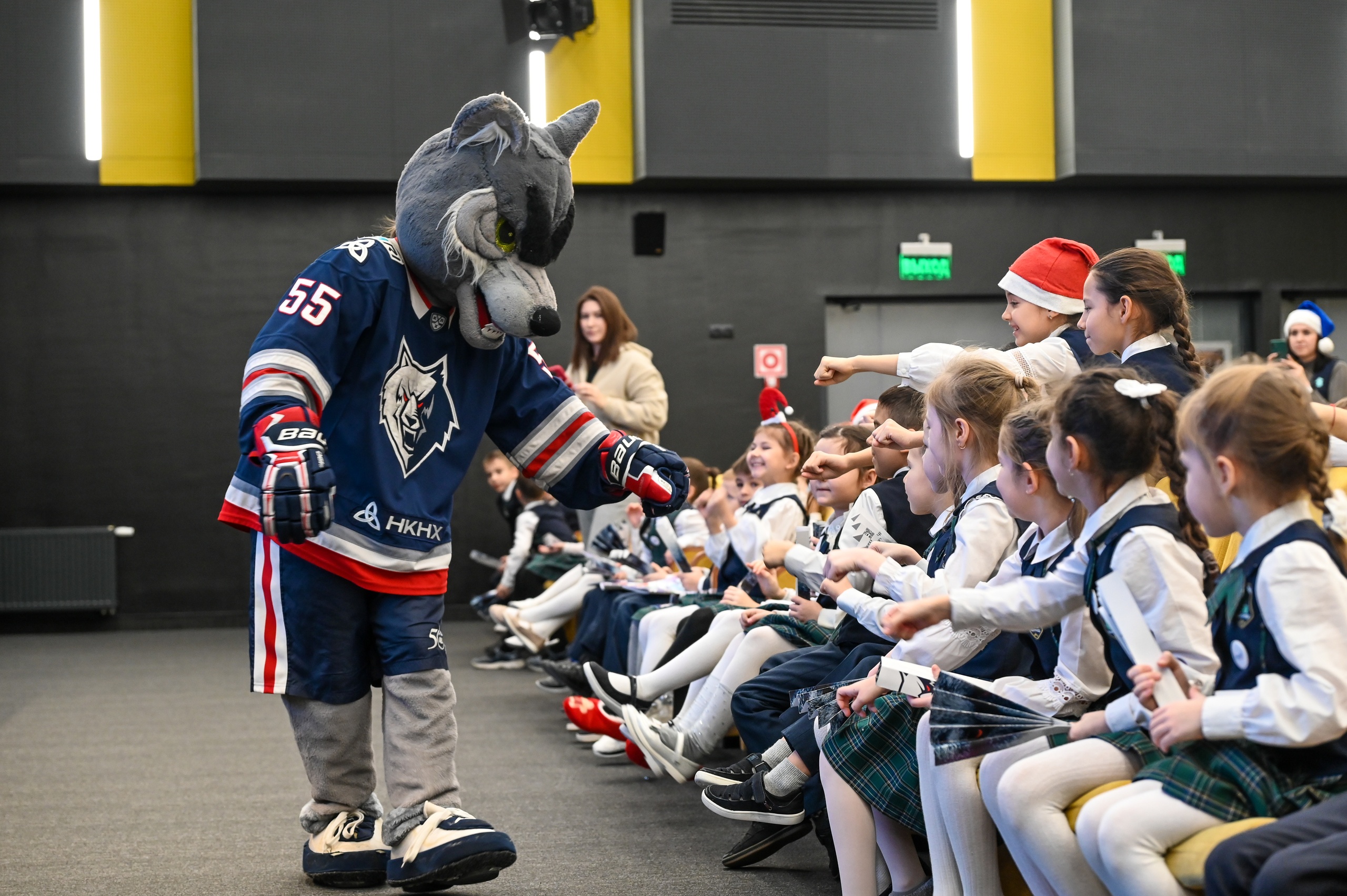 Увидеть небольшой танец от группы поддержки, посмотреть мультфильм о хоккее, сделать фото с Волком, получить автограф Ильи Хохлова - и все это тоже урок КХЛ. Каждый ребенок получил в подарок книжку о хоккее и главное – билет на ближайший домашний матч «Нефтехимика».