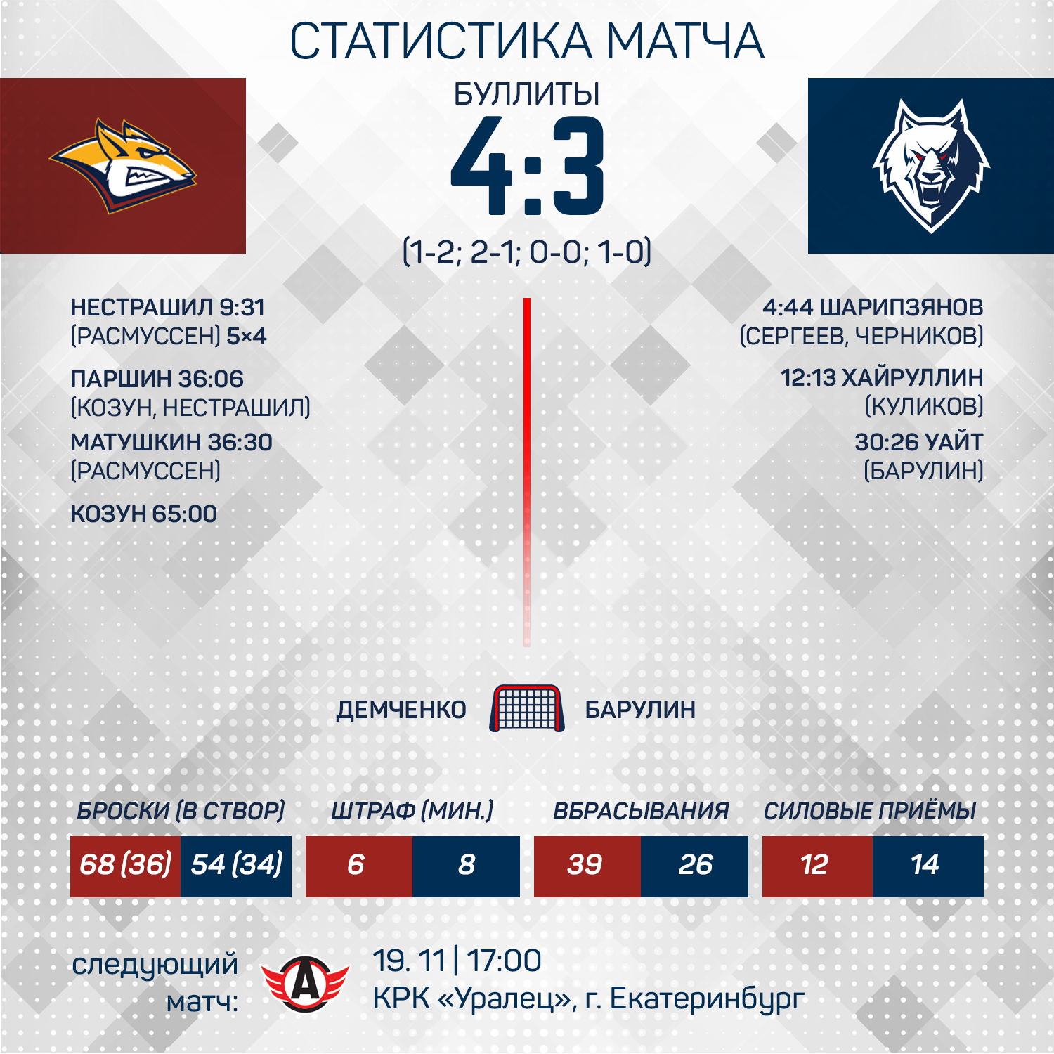 После паузы на игры сборных, «Нефтехимик» начал уральскую серию матчей поединком с «Металлургом». Игра получилась крайне упорной и все решилось в серии буллитов, где наша команда уступила 3:4.