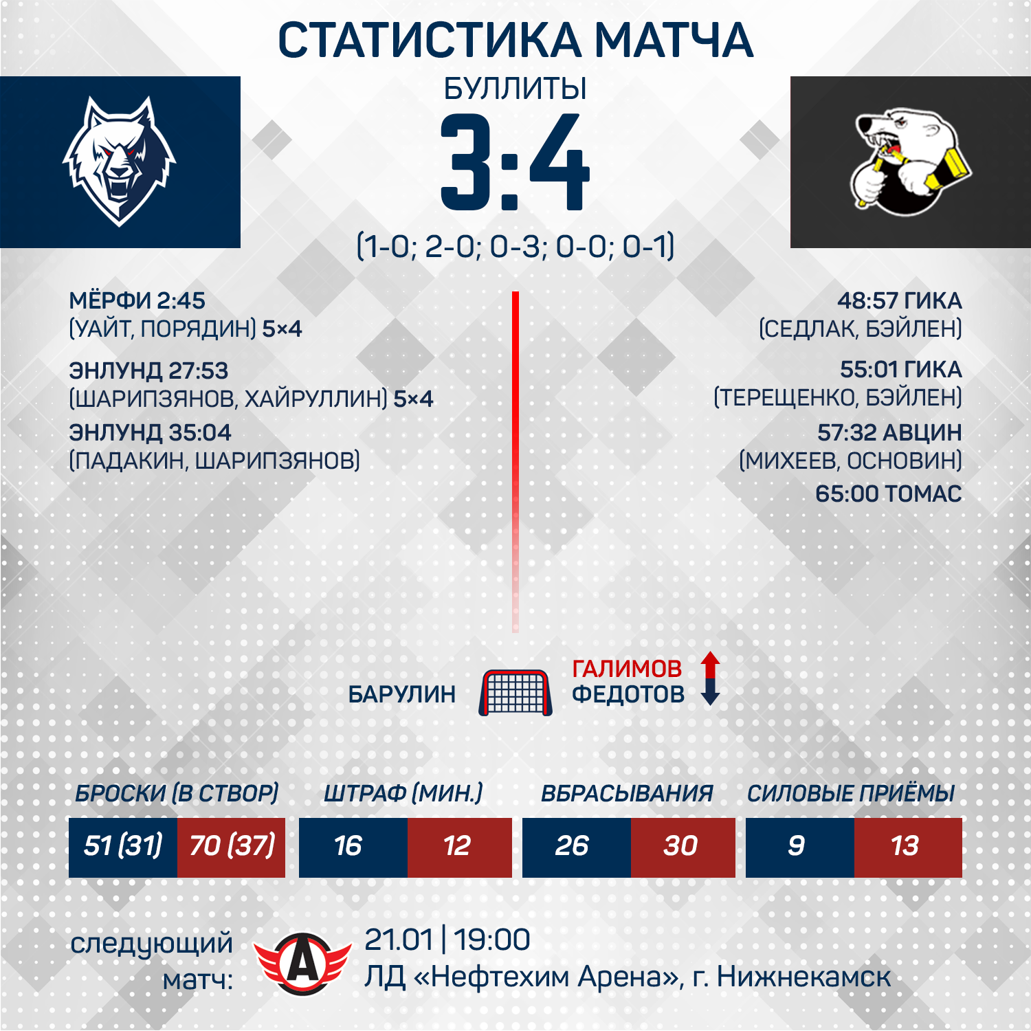 К 49-ой минуте поединка «волки» вели с комфортным счетом 3:0, благодаря шайбе Райана Мерфи и дублю Йонаса Энлунда, но такого запаса прочности нашей команде не хватило. В основное время гости смогли сравнять счет, а в серии послематчевых бросков вырвать победу. 3:4 - очень обидное поражение.Следующие две игры наша команда также проведет дома. 21 января сыграем с «Автомобилистом», а 24 января - с «Сибирью». Билеты можно приобрести в кассах или онлайн на нашем сайте.