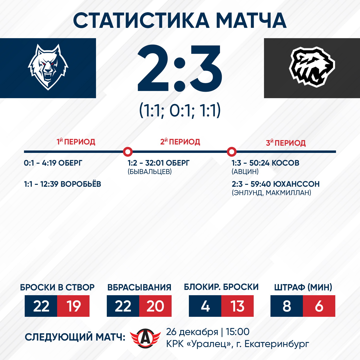 Интрига в матче продолжала жить и в заключительной двадцатиминутке. «Волки» боролись до последних секунд. При счете 1:3 тренерский штаб нашей команды заменил голкипера на шестого полевого. Это дало результат - Линус Юханссон ознаменовал свой дебютный матч в нашем составе голом. До сирены осталось еще 20 секунд, но спасти матч уже не получилось.