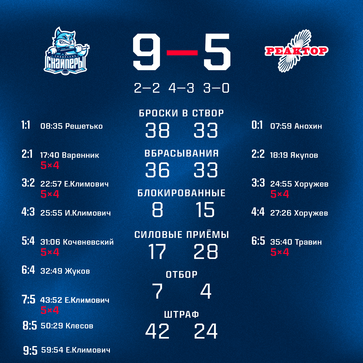 После вчерашней победы со счетом 7:4, сегодня, в повторном матче, «Реактор» уступил «Сибирским Снайперам» 5:9.