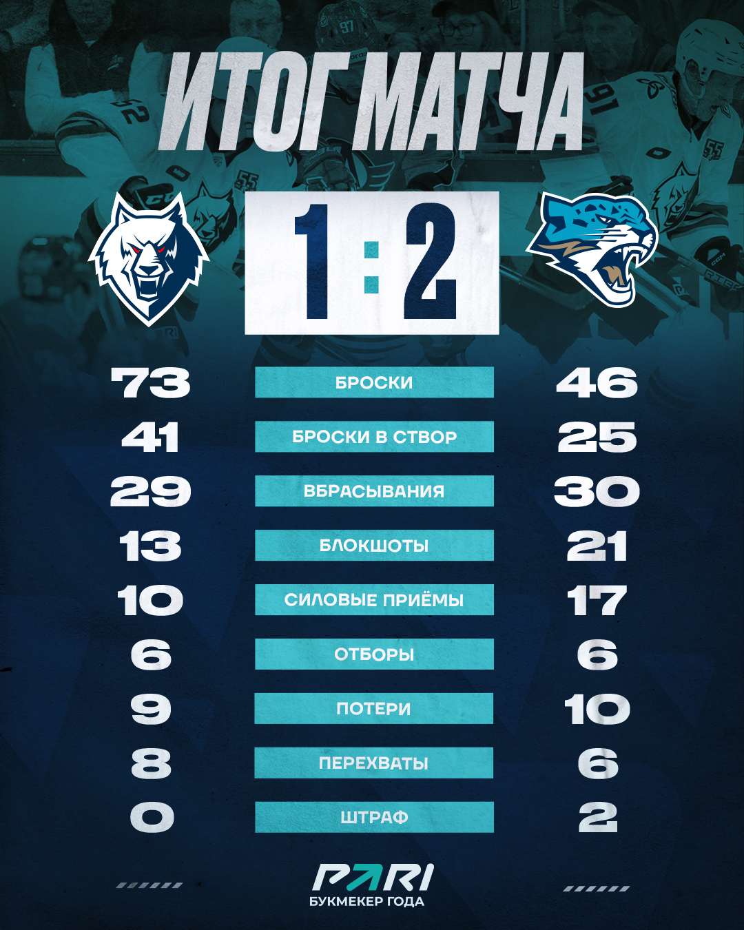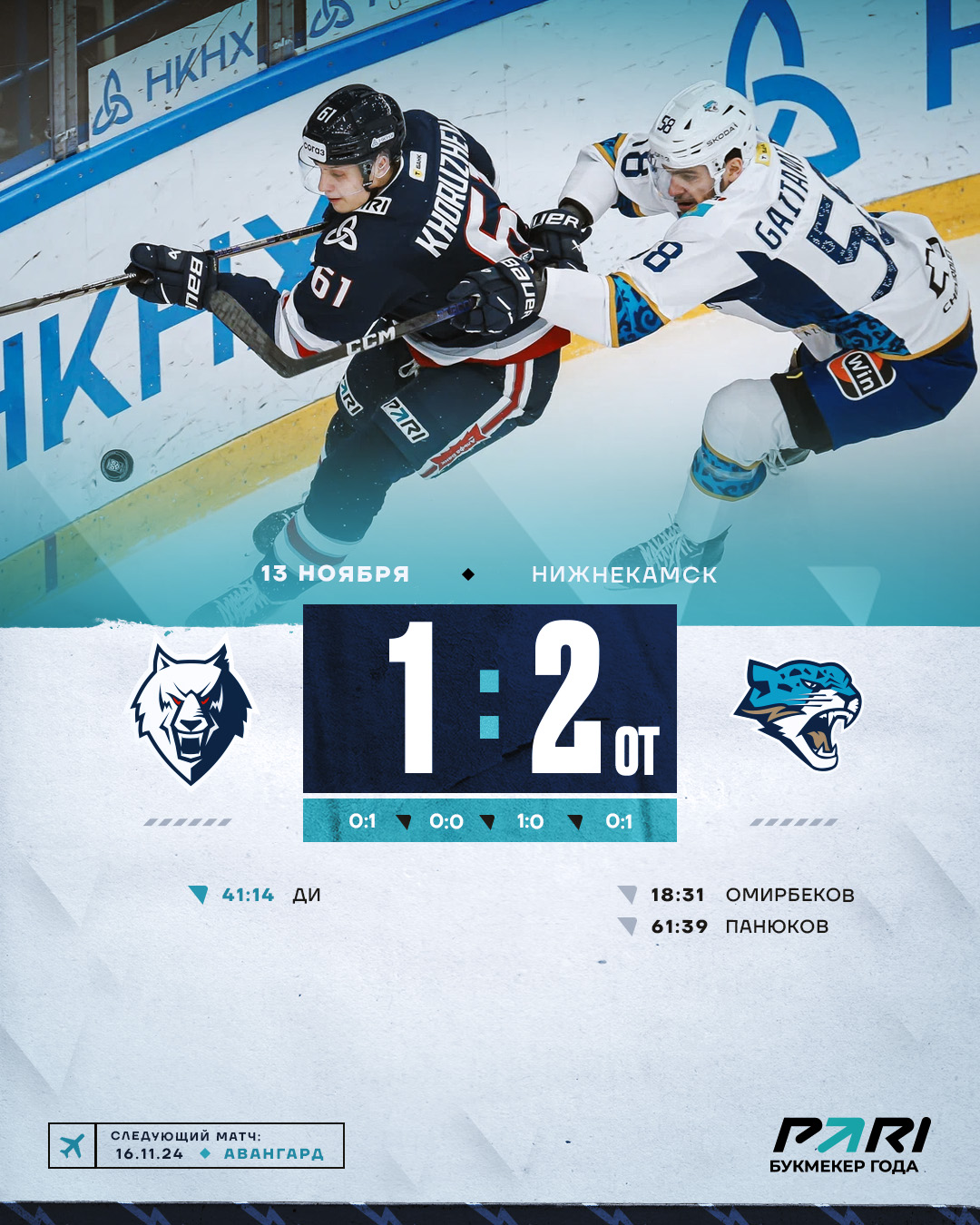 На третий период «волки» вышли с трудной задачей – отыграться. Это им удалось сразу. Жан-Себастьен Ди сравнял результат. Пятый результативный балл на свой счет записал Барбер. Однако победитель матча определился только в дополнительное время. Сначала упустил стопроцентный шанс забить Лещенко. После его броска шайбу отразила штанга ворота «Барыса». В обратной атаке счастье улыбнулась гостям. Оставленный без присмотра Панюков принес своей команды 2 очка.