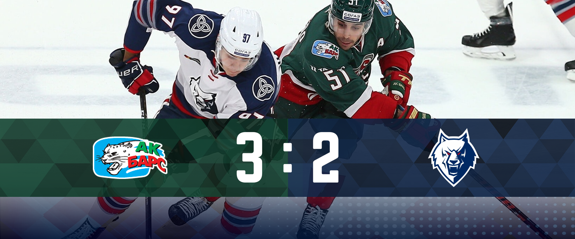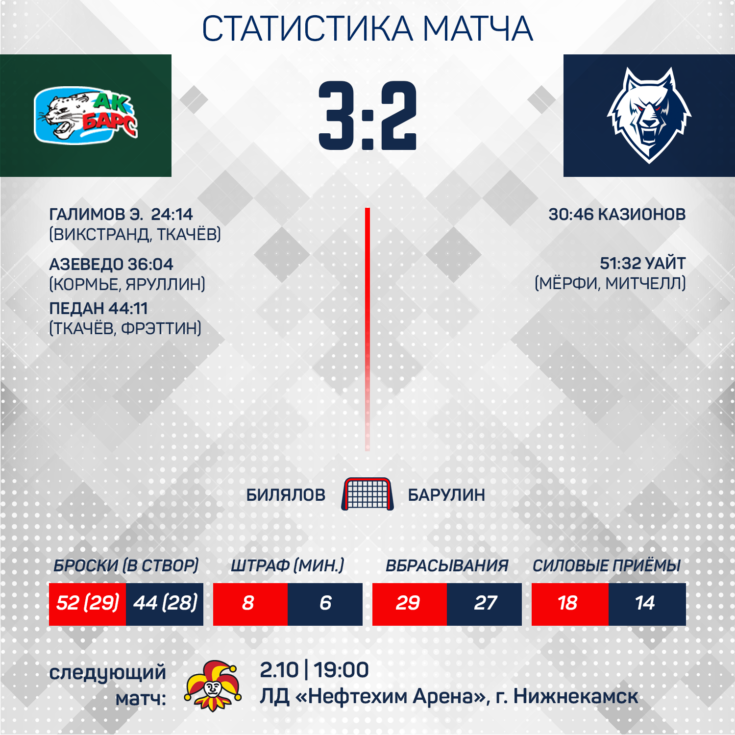 Счет был открыт «Ак Барсом» в середине матча, но спустя несколько минут Денис Казионов смог сравнять цифры на табло. Однако на второй перерыв «волки» все же ушли уступая 1:2.В начале третьего периода счет и вовсе стал 1:3 не в нашу пользу, но «Нефтехимик» не сдался. «Волки» провели практически весь период в атаке. Мэтт Уайт сократил разрыв в счете 2:3. Получился и финальный штурм казанских ворот, но немного не хватило удачи. Уступаем 2:3.