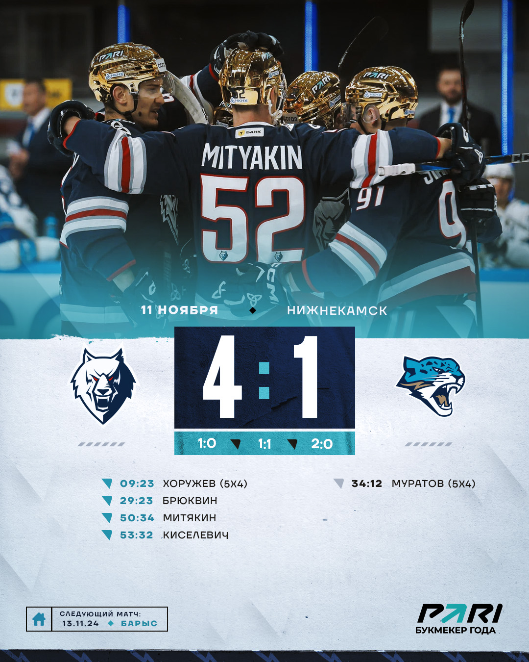 В третьем периоде Митякин забросил третью и очень важную шайбу. По сути он снял вопрос о победителе матча. В этом эпизоде четвертую результативную передачу в последних четырех играх на свой счет записал американский легионер Барбер. Окончательный счет в матче установил Киселевич, для которого этот гол стал первым в составе «Нефтехимика».