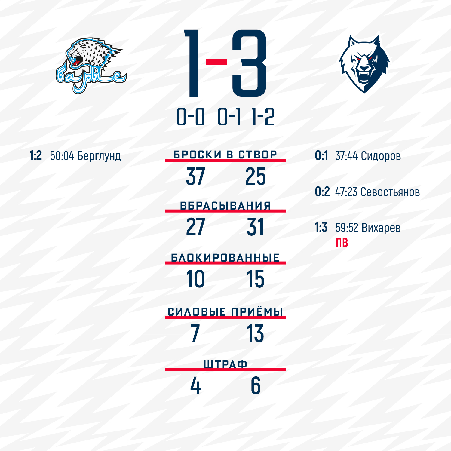Практически до конца второго периода сегодня шла острейшая игра с невероятным количеством голевых моментов, но шайба в сетку не шла. Только на 38-ой минуте своим мощным броском Михаил Сидоров прервал эту «засуху».Как обычно, все решилось в заключительном периоде. В его середине достиг цели дальний бросок Александра Севостьянова. Для защитника этот гол стал дебютным в КХЛ. Однако вскоре хозяева одну шайбу смогли отыграть. «Барыс» мог и сравнивать счет, но выдающуюся игру провел Франс Туохимаа, отразивший сегодня 36 бросков. Денис Вихарев за 8 секунд до сирены поразил пустые ворота соперника и установил окончательный счет. 3:1 - наша важнейшая победа!