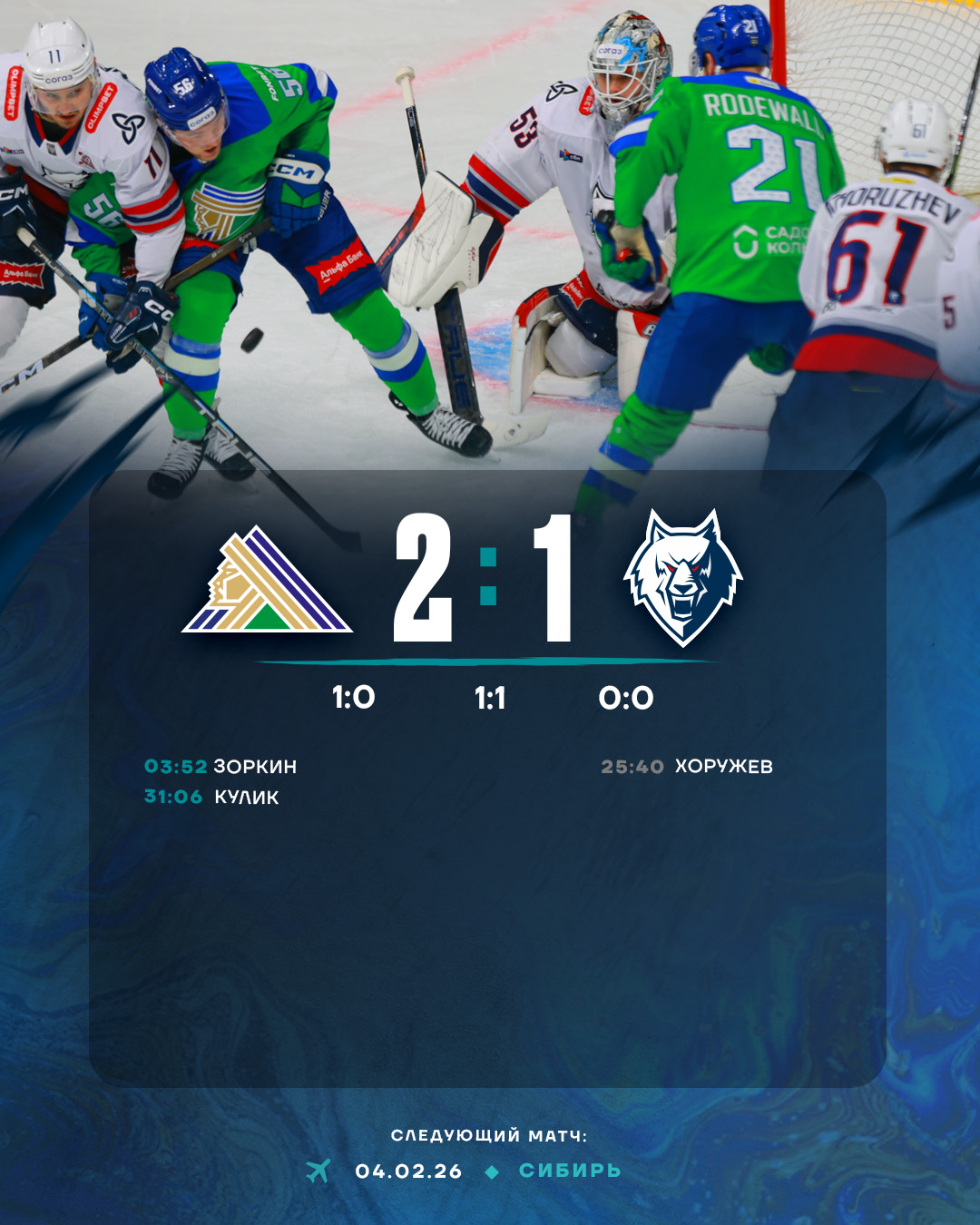 На 32-й минуте «Салават Юлаев» вновь вышел вперед. Никем не перекрытый защитник Евгений Кулик замкнул передачу Егора Сучкова.