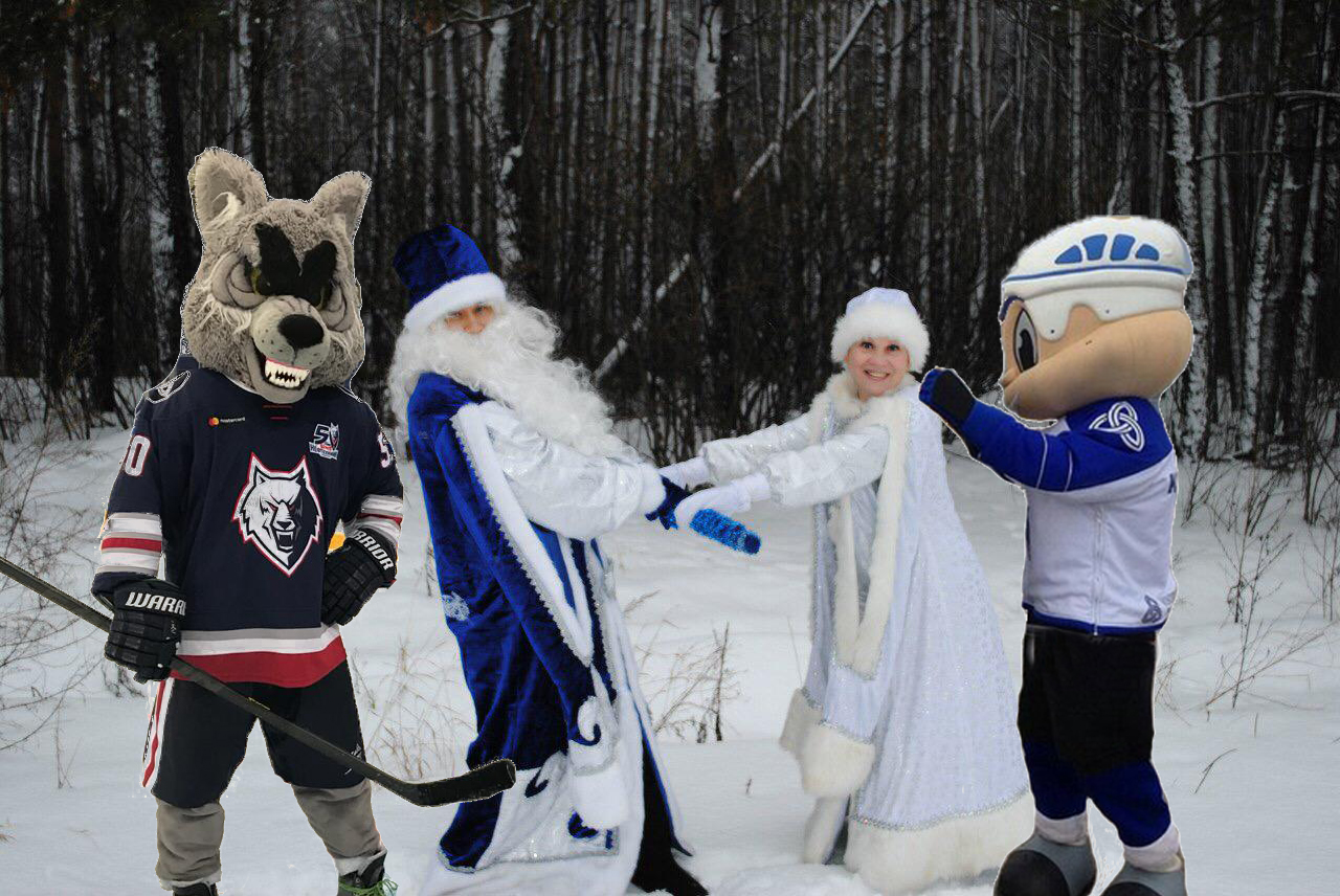 В Новогодний праздник принести радость и счастье в ваш дом, исполнить заветную мечту вашего ребенка помогут волшебный дедушка Мороз, прелестная Снегурочка в компании любимых персонажей – талисманов ХК «Нефтехимик» «Волка» и «Каучонка».