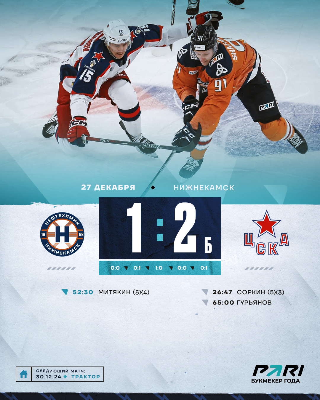 Третий период прошел под значительным преимуществом «Нефтехимика». Надо было спасти игру. Хорошие моменты для взятия ворот армейцев имели Точилкин, Селезнёв, но шайба упорно не шла в ворота. Да и Гамзин играл безупречно. Однако он и стал косвенным виновником пропущенной шайбы. Дмитрий нарушил правила и получил двухминутное удаление. Пока за него штраф отбывал полевой игрок, «волки» сравняли счет. Отличился Митякин.