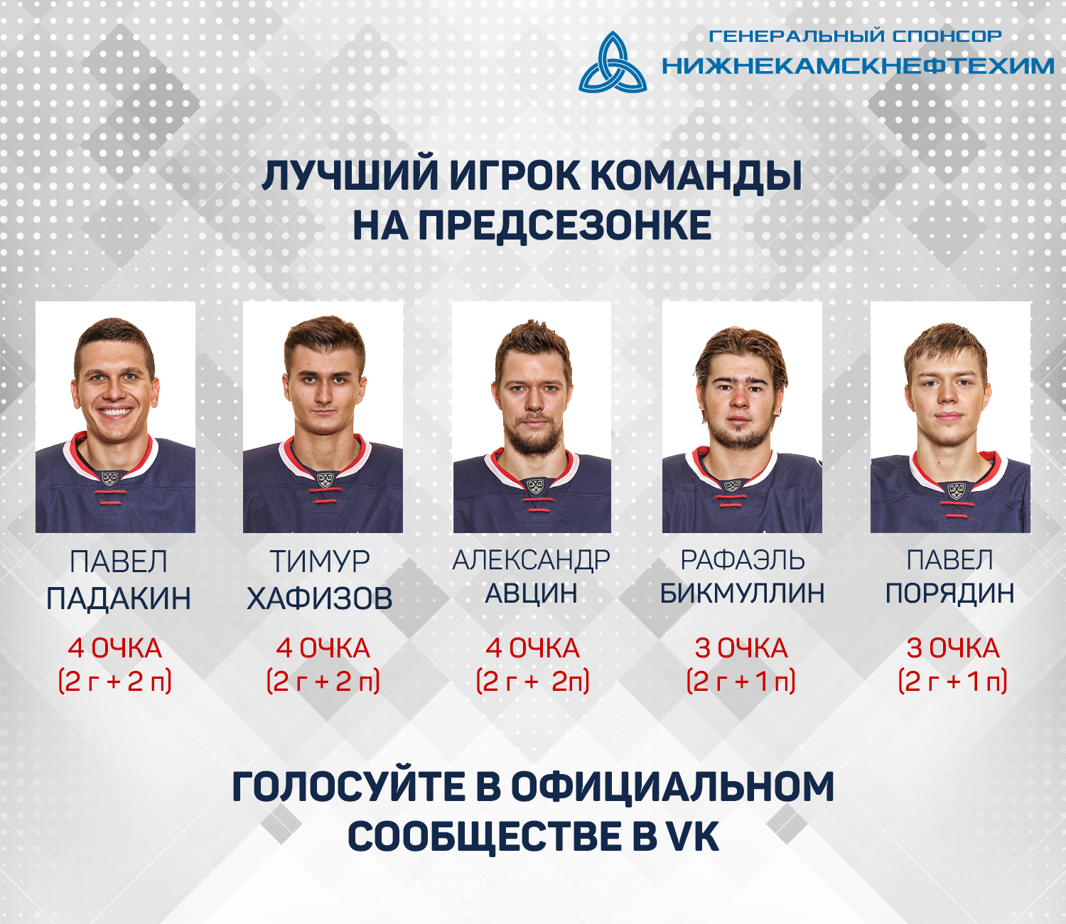 Хоккейный клуб «Нефтехимик» совместно с генеральным спонсором ПАО «Нижнекамскнефтехим» предлагают болельщикам выбрать лучшего игрока прошедшей предсезонки.
