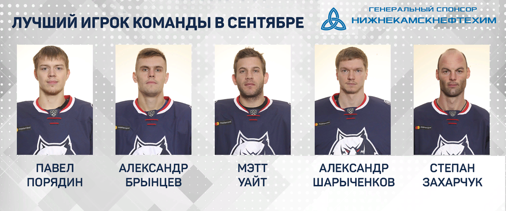 Хоккейный клуб «Нефтехимик» совместно с генеральным спонсором ПАО «Нижнекамскнефтехим» предлагают вам выбрать лучшего игрока нашей команды по итогам прошедшего месяца. Перед вами пять претендентов.