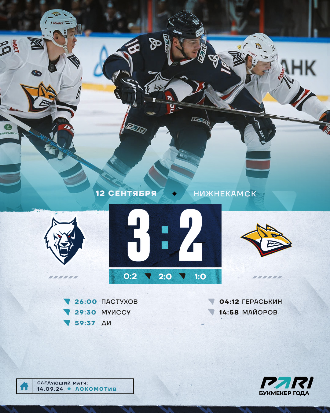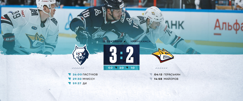 Первая домашняя игра для «волков» началась неудачно. В первом периоде гости отличились дважды.Нижнекамцы симметрично смогли ответить во вторые 20 минут. Заброшенными шайбами отличились Илья Пастухов и Жоэ Кристоф Муиссу. Для 18-летнего форварда шайба стала дебютной в КХЛ. Он стал вторым игроком 2006 года рождения забивший в Континентальной хоккейной лиге.