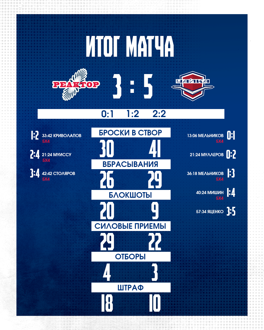 Заключительный период снова начался с пропущенного гола в меньшинстве, но надо отдать должное нижнекамцам. Они смогли проявить характер и чуть больше, чем за минуту дважды реализовали большинство. Отличились Жоэ Кристоф Муиссу и Кирилл Столяров. Казалось, еще немного и счет станет равным, но «реакторщиков» подвела серия удалений, а когда она завершилась, то уже оставалось совсем немного времени, да еще и нижегородцы смогли реализовать одну из своих контратак. 3:5 — довольно обидное поражение.